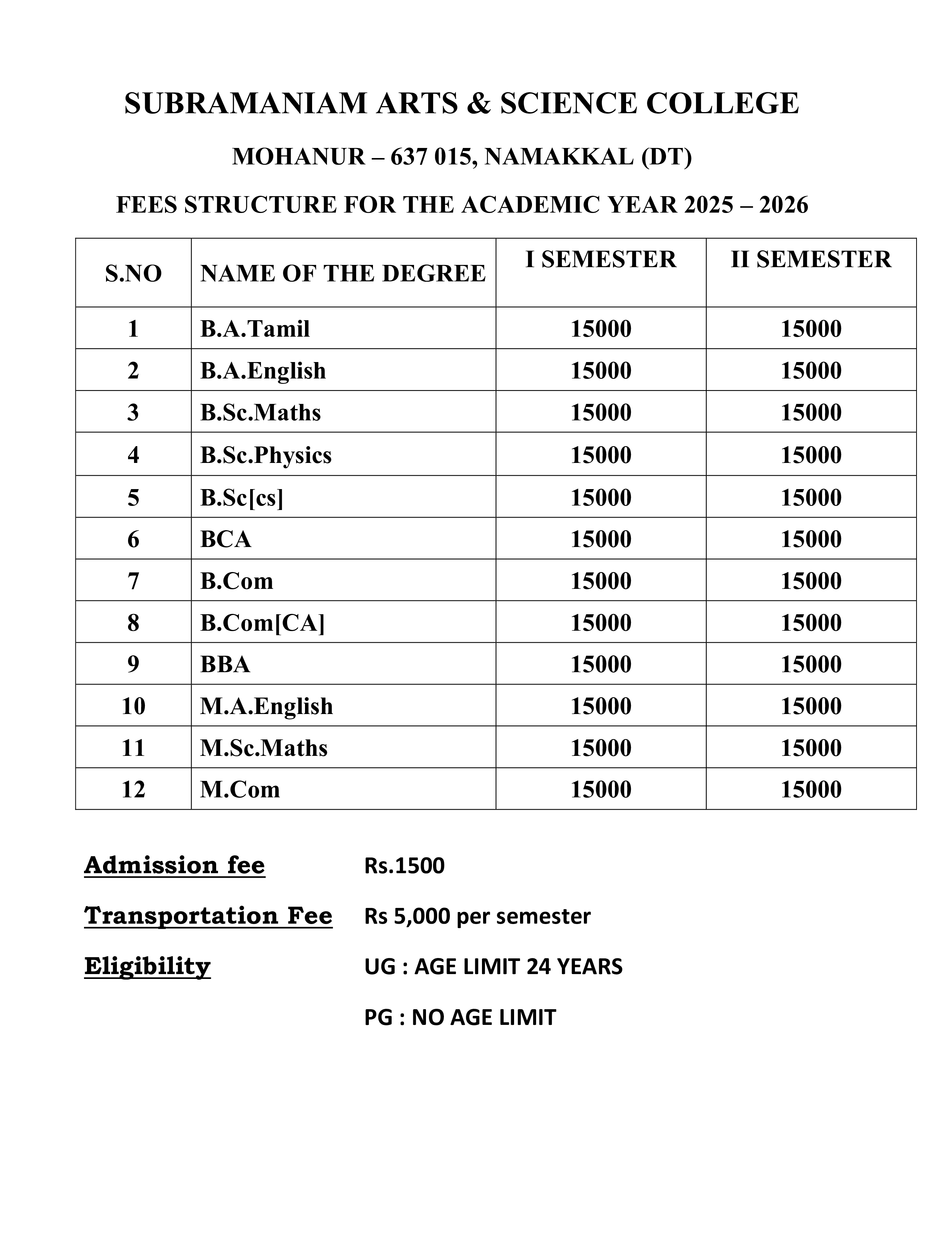 Subramaniyam Arts & Science College Established in the year 1968, the trust has been in the forefront of providing high quality education in the region of Namakkal an upcoming & yet-to-be-developed region of Tamil Nadu.Spurred by overwhelming enthusiasm and ambitious zeal, Prof.S.Palaniyandi has been the harbinger of literacy development, by founding this educational institution in and around the region. Since 1968, there is no looking back. Today,....